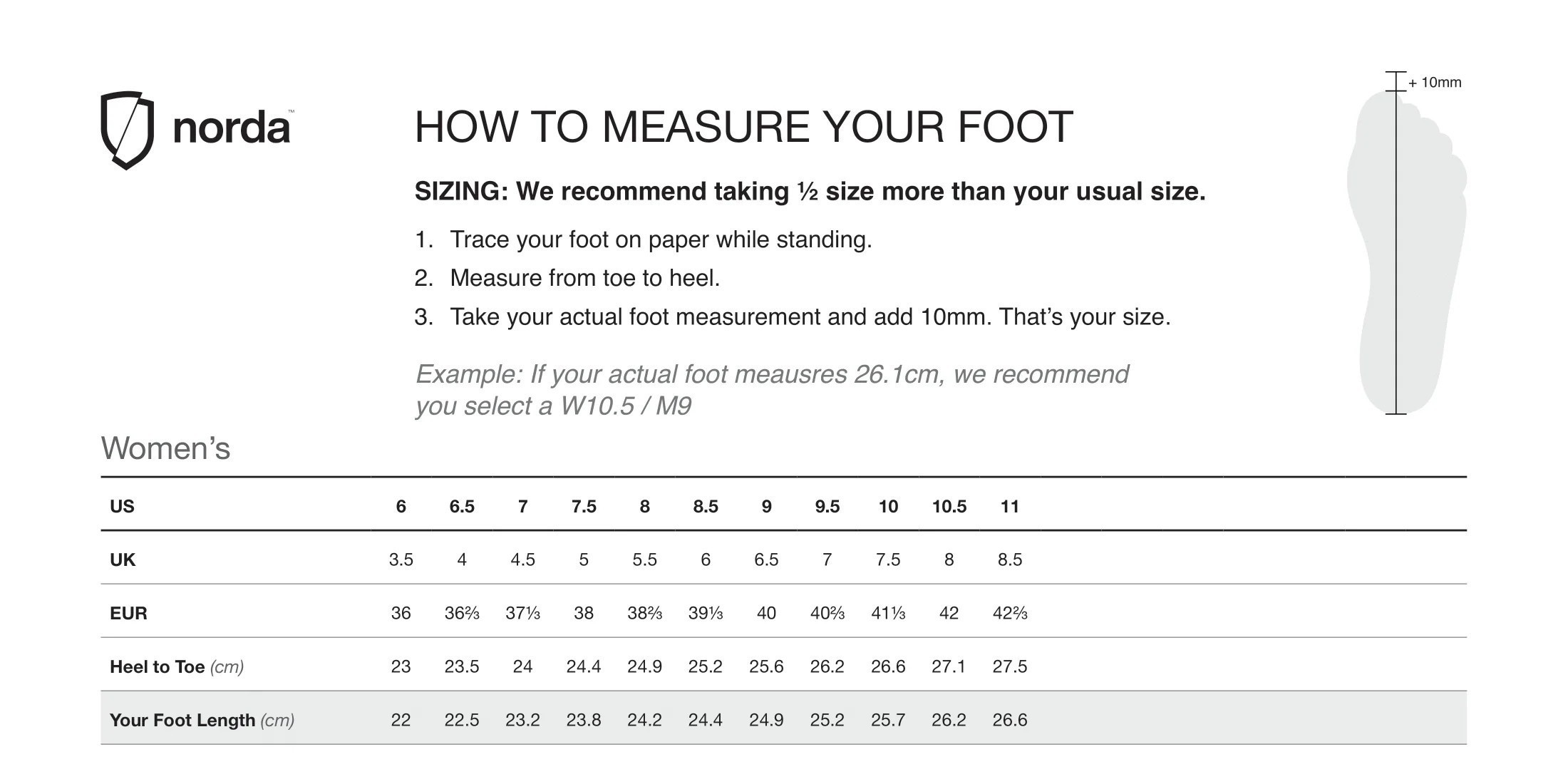 เช่น  วัดเท้าได้  26.1 เซนติเมตร  แนะนำ + 1 CM เป็น 27.1 เซนติเมตร  เลือก เบอร์ 10.5 W ใกล้เคียงที่สุด  ตาม SIZECHART ครับ